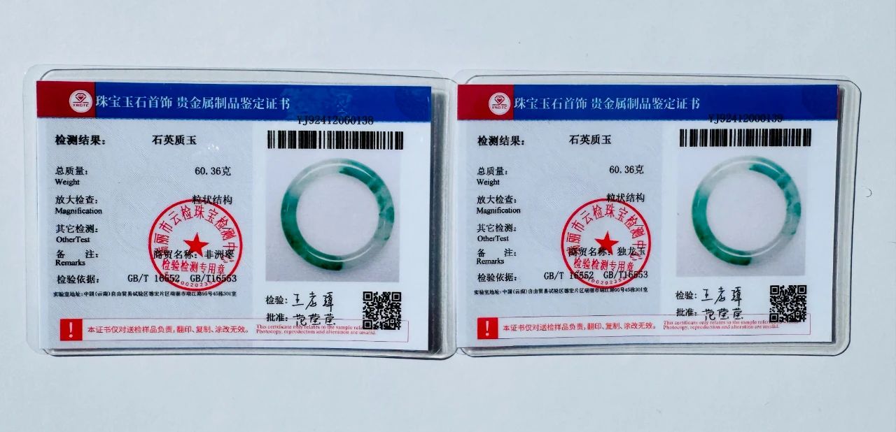 现在非洲翠出质检证书,商贸名称一栏,既可以写“非洲翠”,也可以写“独龙玉”。